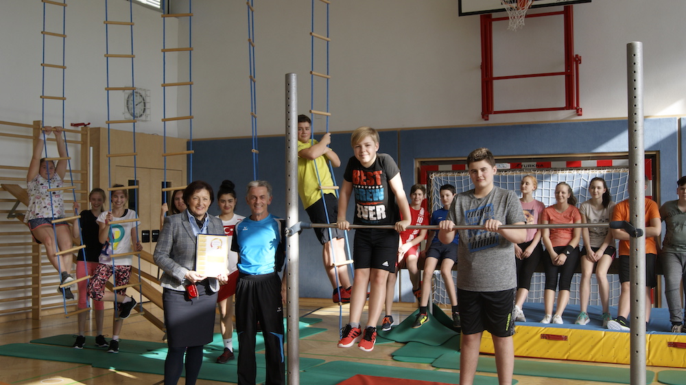 Direktorin OSR Romana Weisgram, auf dem Bild mit Turnlehrer Kurt Jillecek und Schülern der 4. Klassen, freut sich über die Auszeichnung, durch die das sportliche Engagement der Schule belohnt wird.