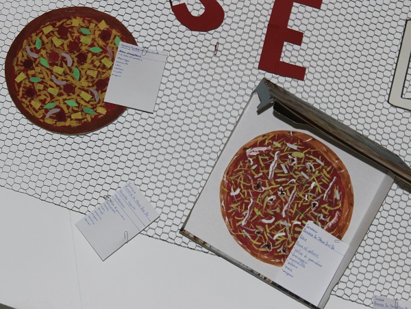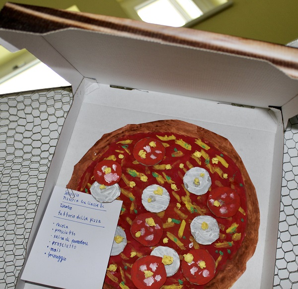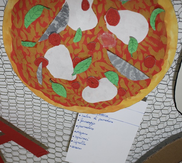 Jede Schülerin und jeder Schüler schrieb im Gegenstand Bildnerische Erziehung die Lieblingszutaten für eine Pizza auf. Diese Bestellung haben wir dann auch noch auf italienisch übersetzt und sie untereinander in der Klasse ausgetauscht. Für die jeweilige Bestellung hat jeder von uns eine Pizza aus Karton ausgeschnitten, bemalt und mit Zutaten beklebt. Anschließend bastelten die schnellsten von uns Fahnen und die Buchstaben für den Namen unserer Pizzeria in den Farben der italienischen Flagge. Andere fertigten Pizzaschieber für den Pizzaofen an.
