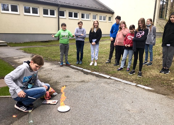 Im April durften sich die Schüler der 2a-Klasse in Experimenten versuchen. Diese Foto gibt einen Einblick, dass es bei diesen Versuchen auch sehr heiß hergehen kann.