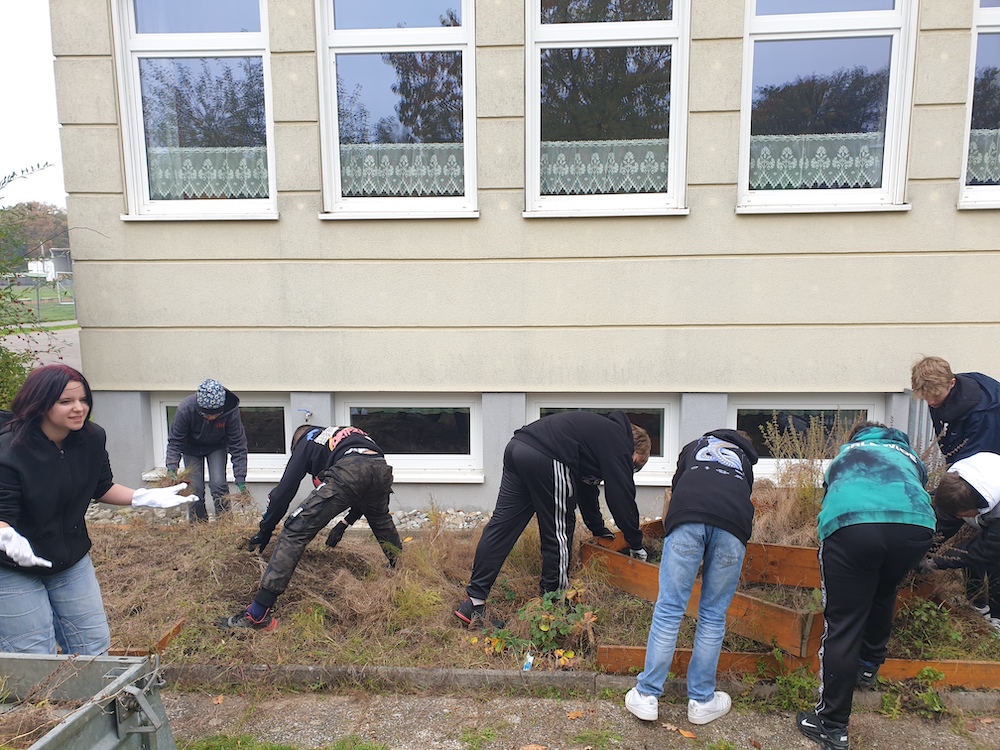 Zugegeben, es sah schon etwas wild aus in unserem Schulgarten. Damit im Frühjahr und Sommer wieder Kräuter, Kartoffeln und anderes Gemüse wachsen können, haben die Schülerinnen und Schüler der 4b abgestorbene Pflanzenreste entfernt und das Beet mit frischer Erde aufgefüllt.