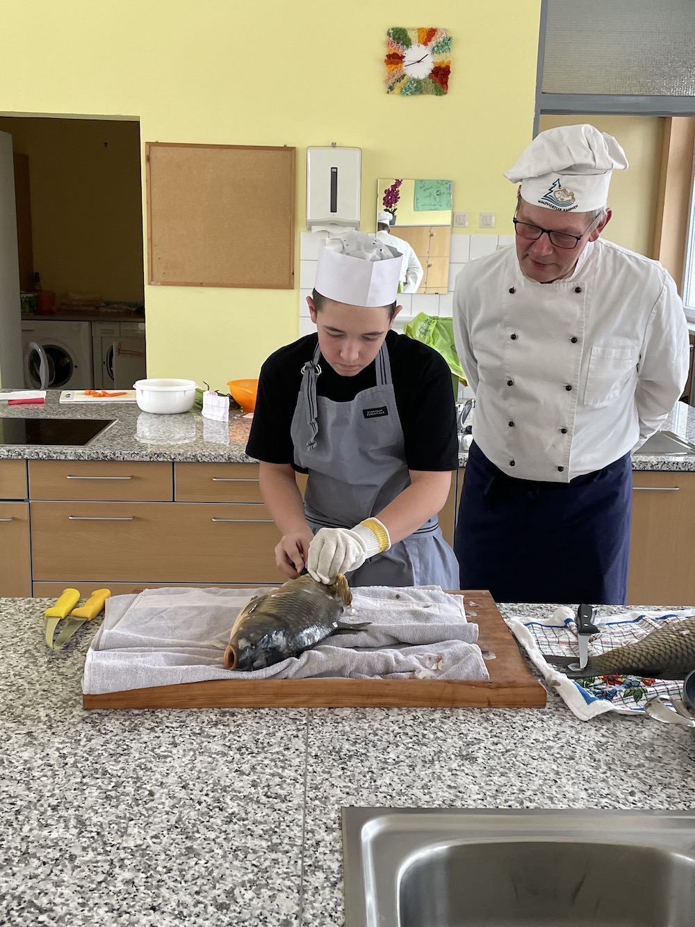 Seit September 2022 sind wir Naturparkschule. Im Rahmen unseres Schulprojekts beteiligen sich unsere Schüler/innen der 3. Klassen im Kochunterricht daran. Dazu wurde Herr Reinhard Sprinzl, ein Koch und Experte für alles, was Schuppen, Flossen und Kiemen hat, eingeladen. Drei Wochen lang besuchte Herr Sprinzl unsere Schüler/innen und begleitete sie im Kochunterricht.