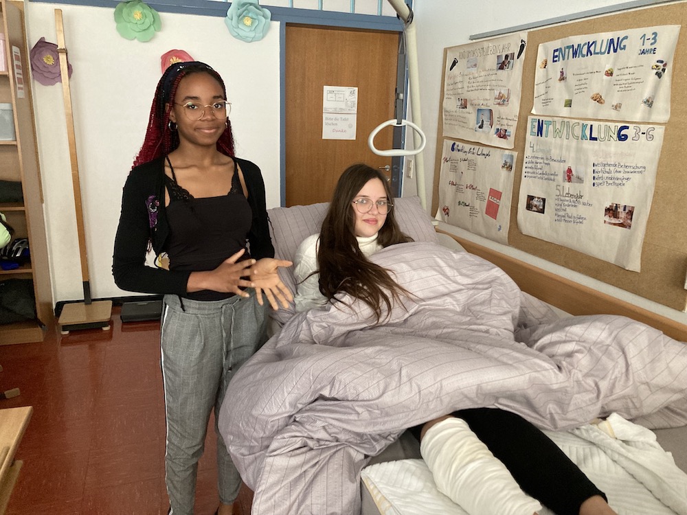 Im Rahmen des Schwerpunktes „Sozial-Vital“ lernten die TeilnehmerInnen des Pflegefit-Kurses, wie man Wadenwickel richtig anlegt. Die SchülerInnen hatten dabei sichtlich Spaß, das Gelernte gleich in die Praxis umzusetzen.