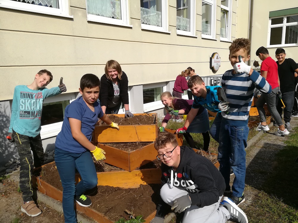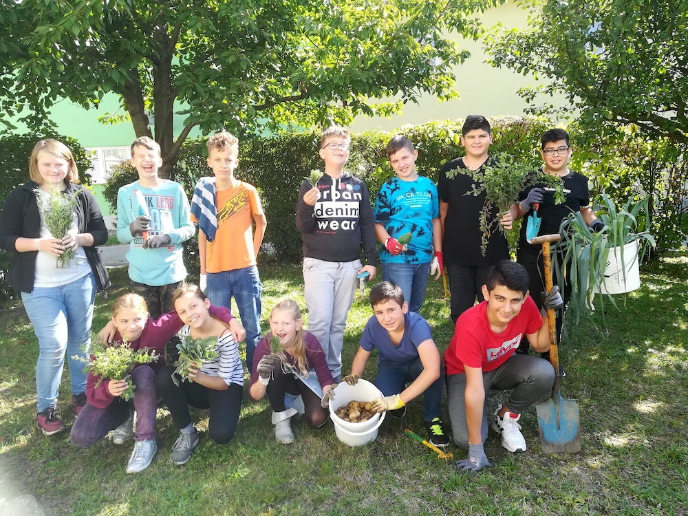 Die Kinder aus der 2a konnten nun ihre angebauten Kartoffeln, Kräuter und Gemüse aus dem Schulgarten ernten und mit nach Hause nehmen.
