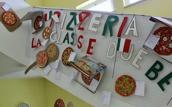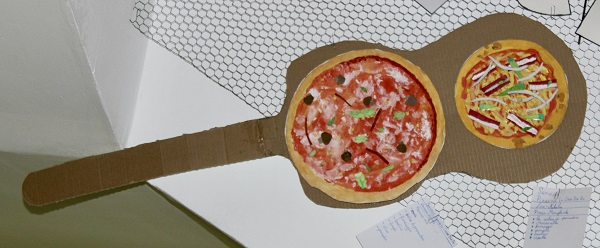 Jede Schülerin und jeder Schüler schrieb im Gegenstand Bildnerische Erziehung die Lieblingszutaten für eine Pizza auf. Diese Bestellung haben wir dann auch noch auf italienisch übersetzt und sie untereinander in der Klasse ausgetauscht. Für die jeweilige Bestellung hat jeder von uns eine Pizza aus Karton ausgeschnitten, bemalt und mit Zutaten beklebt. Anschließend bastelten die schnellsten von uns Fahnen und die Buchstaben für den Namen unserer Pizzeria in den Farben der italienischen Flagge. Andere fertigten Pizzaschieber für den Pizzaofen an.