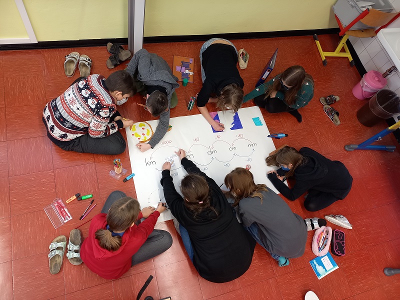Auch im Mathematikunterricht ist Kreativität gefragt. Einige Schüler*innen der 2. Klassen gestalten ein Plakat zu den Längenmaßen.