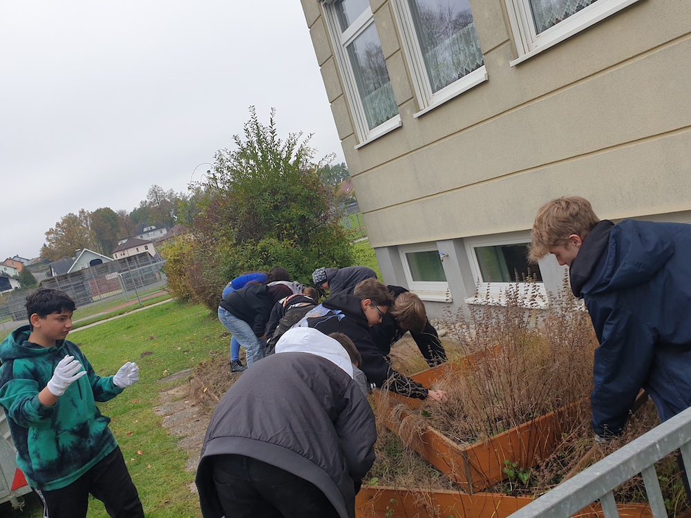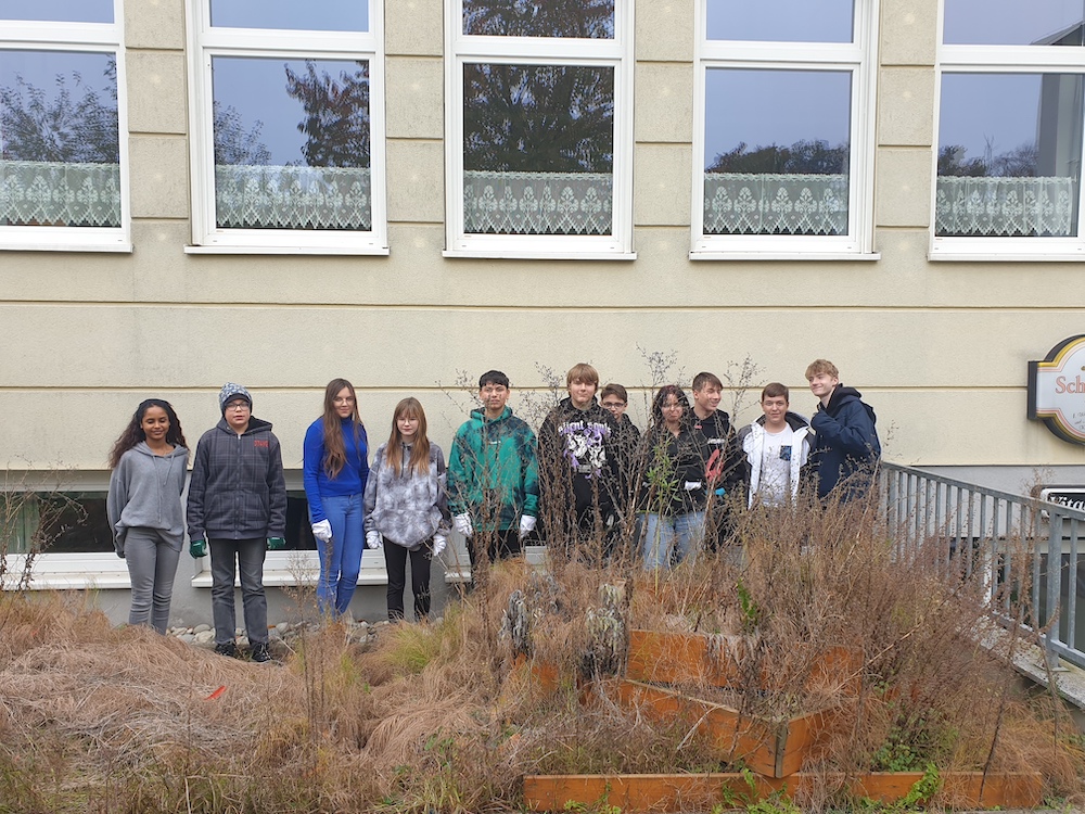 Zugegeben, es sah schon etwas wild aus in unserem Schulgarten. Damit im Frühjahr und Sommer wieder Kräuter, Kartoffeln und anderes Gemüse wachsen können, haben die Schülerinnen und Schüler der 4b abgestorbene Pflanzenreste entfernt und das Beet mit frischer Erde aufgefüllt.