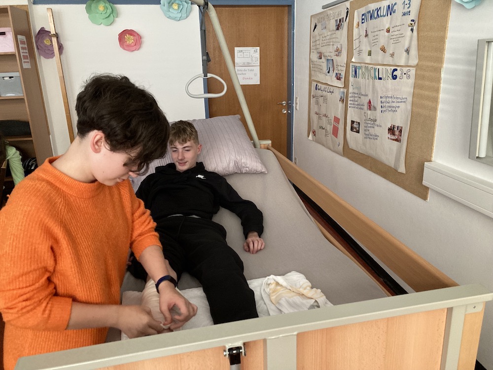 Im Rahmen des Schwerpunktes „Sozial-Vital“ lernten die TeilnehmerInnen des Pflegefit-Kurses, wie man Wadenwickel richtig anlegt. Die SchülerInnen hatten dabei sichtlich Spaß, das Gelernte gleich in die Praxis umzusetzen.