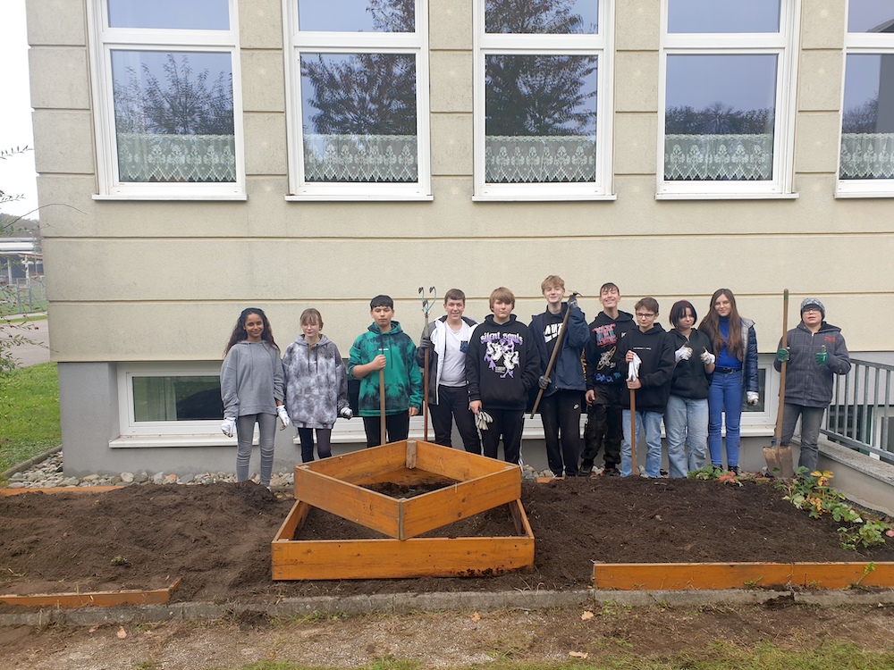 Zugegeben, es sah schon etwas wild aus in unserem Schulgarten. Damit im Frühjahr und Sommer wieder Kräuter, Kartoffeln und anderes Gemüse wachsen können, haben die Schülerinnen und Schüler der 4b abgestorbene Pflanzenreste entfernt und das Beet mit frischer Erde aufgefüllt.
